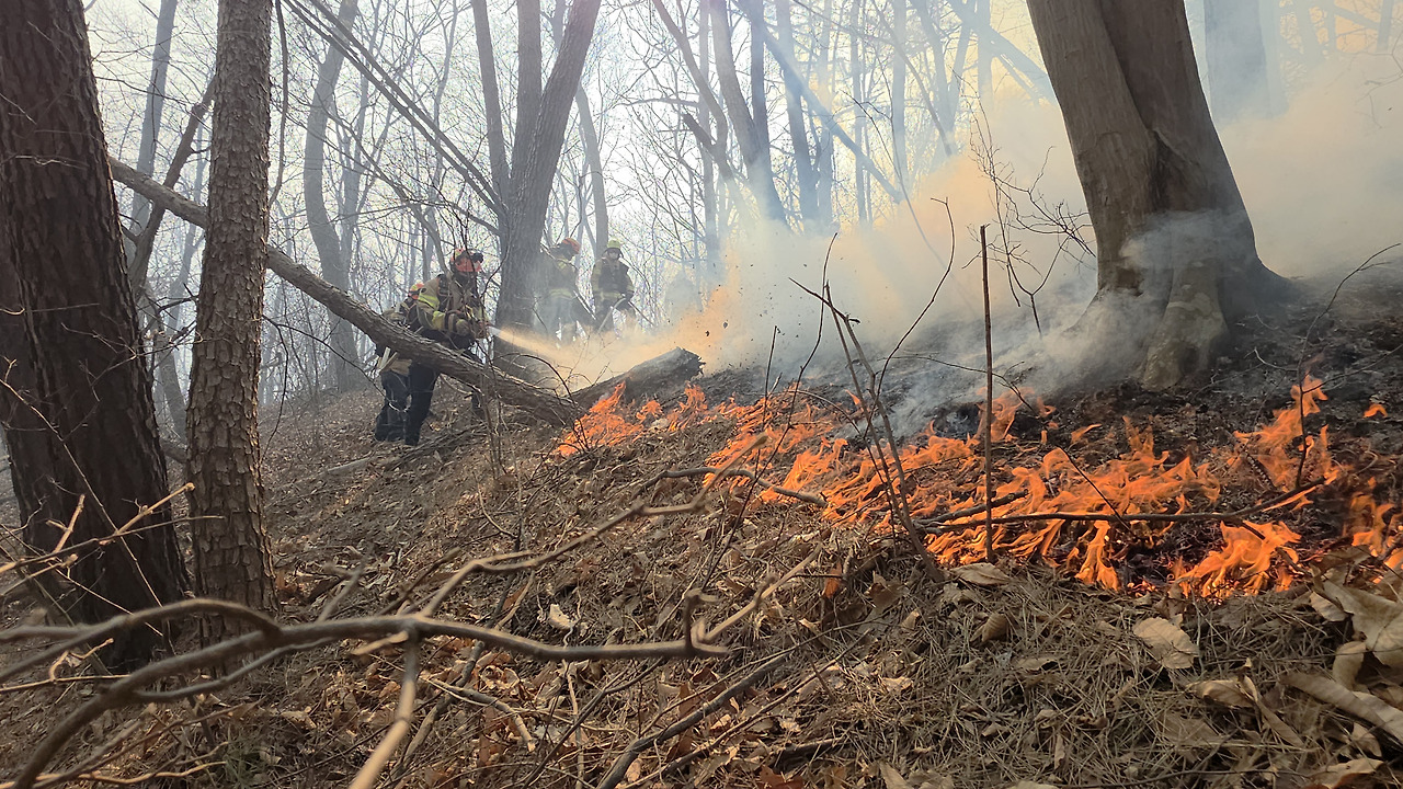 주불 진화가 완료된 이후에도 안심할 수 없었던 이유는 재발화 위험이 상존했기 때문입니다. 실제로 문무대왕면 산불은 잔불 감시 단계에서 다시 불이 살아나며 재발화가 확인되었습니다. 재발화 지점은 급경사지이자 지형 고도가 높은 곳으로, 인력 접근 자체가 쉽지 않았습니다. 여기에 송전탑이 인근에 위치해 있어 안전 문제로 헬기 투입이 불가능한 상황이 겹쳤습니다. 당국은 결국 헬기 진화 대신 지상 인력을 중심으로 방어선을 구축하고, 연소 확산을 차단하는 방식으로 대응할 수밖에 없었습니다.