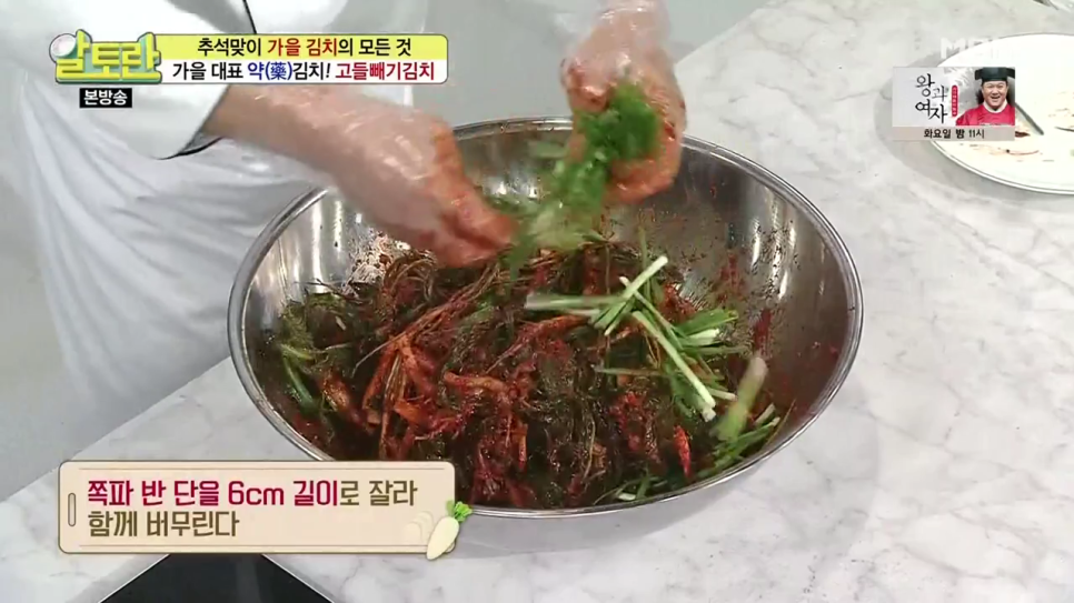 이렇게 만든 양념장은 색이 진하고 점성이 있는 형태가 되어야 합니다. 마지막으로 6cm 길이로 자른 쪽파 반단을 넣고 가볍게 섞습니다. 쪽파는 김치에 향긋함과 은은한 단맛을 더해줍니다.
