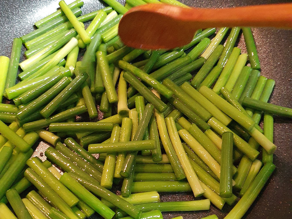 마늘쫑볶음에서 가장 많이 실패하는 단계가 바로 손질입니다. 마늘쫑의 끝부분과 겉껍질 중 단단한 부분을 제거한 뒤, 4~5cm 길이로 일정하게 썰어주는 것이 중요합니다. 길이가 너무 길면 볶는 과정에서 휘어지며 고르게 익지 않고, 너무 짧으면 씹는 맛이 줄어듭니다. 선택 사항이지만 끓는 물에 소금 한 꼬집을 넣고 30초에서 1분 정도 살짝 데친 뒤 찬물에 헹궈 물기를 제거하면 색감이 살아나고 볶는 시간이 단축됩니다. 이 과정은 특히 마늘쫑이 굵거나 단단할 때 유용합니다.