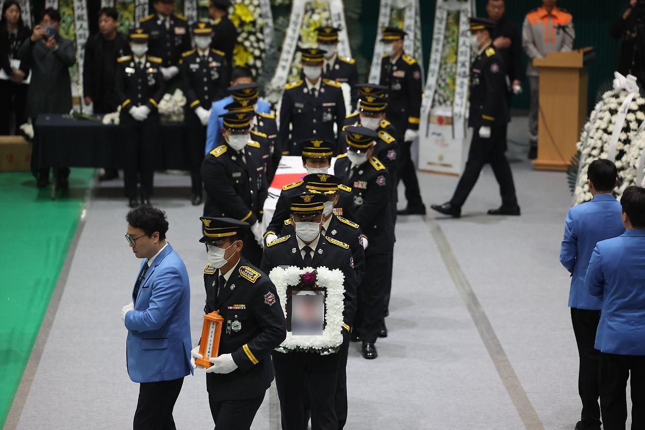 영결식장은 유가족과 동료 소방관들의 깊은 슬픔 속에 진행되었으며, 현장은 눈물과 침묵이 교차하는 엄숙한 분위기로 유지되었습니다.
