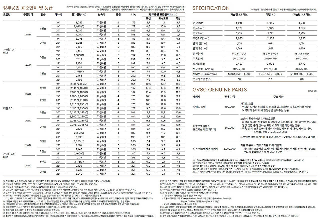- GV80 가솔린 2.5 터보 5인승 기본 모델: 약 6,945만 원
