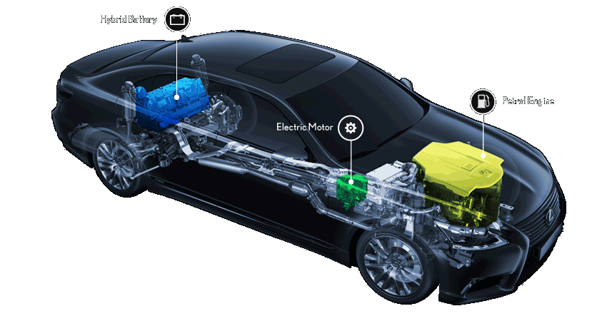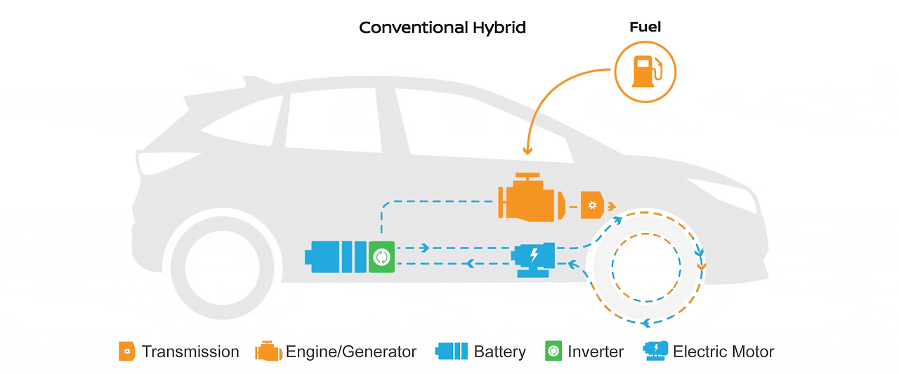 하이브리드 자동차는 내연기관 엔진과 전기 모터를 함께 사용합니다. 배터리 용량은 크지 않으며, 외부 전원으로 충전할 수 없습니다. 대신 엔진 구동과 회생제동 기능을 통해 자체적으로 배터리를 충전합니다.