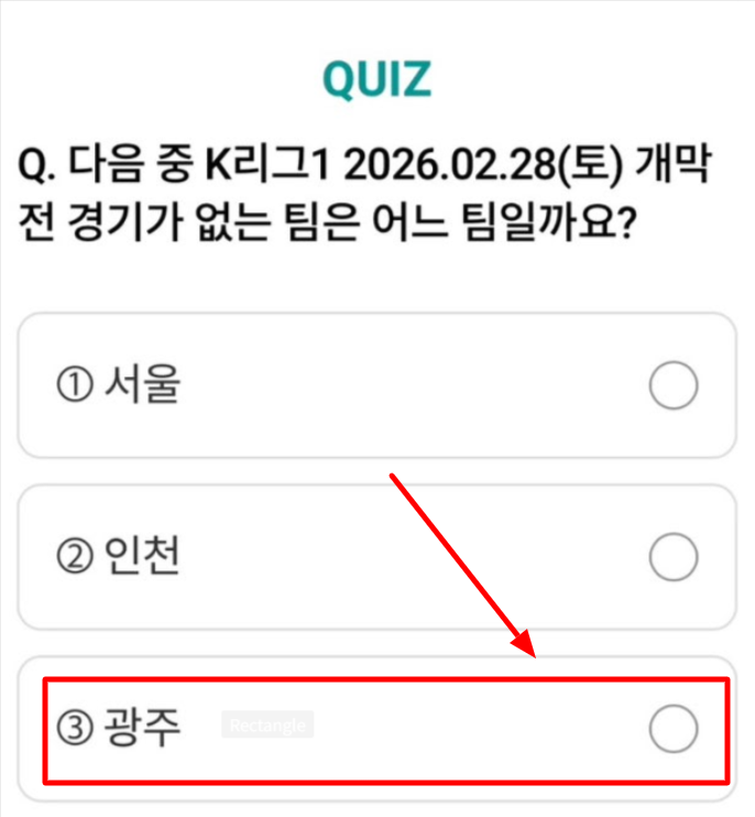 결론부터 말씀드리면, 2월 7일 하나원큐 축구퀴즈의 정답은 광주였습니다. 이는 단순 추측이 아니라, 실제 개막전 일정 편성 여부를 기준으로 확인한 결과입니다. 서울, 인천, 김천은 모두 해당 날짜에 개막전이 예정되어 있었지만, 광주는 2월 28일 일정에서 제외되어 있었습니다. 따라서 문제에서 요구한 ‘개막전 경기가 없는 팀’이라는 조건에 정확히 부합합니다.
